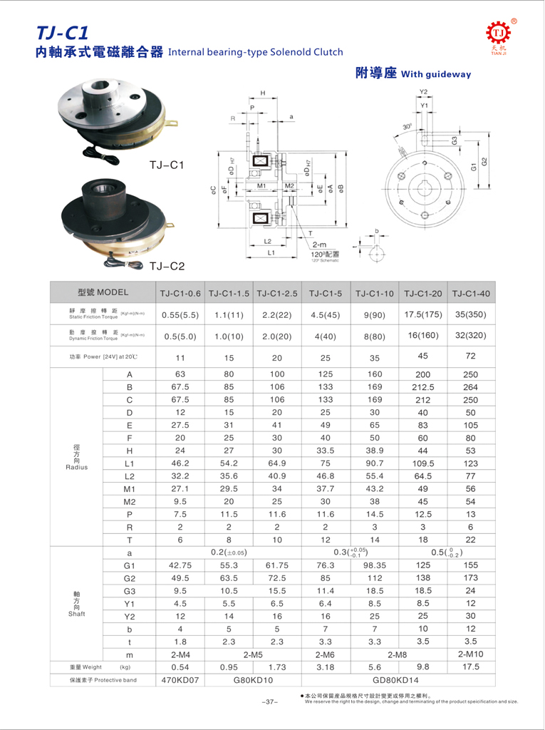 东莞天机传动(台湾天机牌)电磁离合器生产厂家制造销售内轴承式电磁离合器(挂钩式电磁离合器),对应的型号是TJ-C2,电磁离合器线圈通电时,在电磁力的作用下,将主动转子与从动转子连接在一起,主动端与从动端同时转动,电磁离合器处于闭合的状态。
