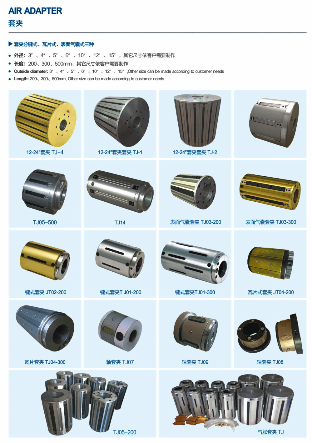 铝合金板条式气胀套夹,钢制瓦片式气胀套夹技术参数:气涨套主体外径Φ150mm,动作外径Φ155mm,适用纸管Φ149-153mm、201-205mm、252-256mm、302-305mm主体长度200mm,250mm,300mm,400mm,500mm等。