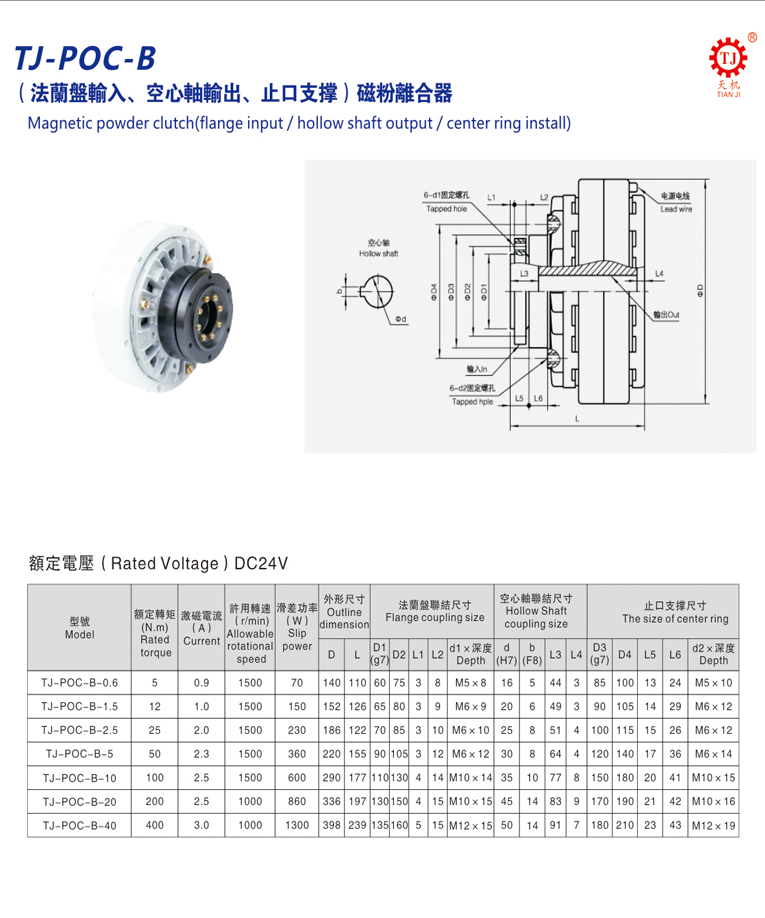 空心轴磁粉离合器(内壳旋转磁粉离合器)产品说明:TJ-POC-B磁粉离合器的工作原理与TJ-POC磁粉离合器系列的工作原理是一样的。TJ-POC-B系列空心轴输出磁粉离合器采用圈静止,虽然采用的是自然冷却方式,由于在输入旋转端的外周部配置了散热片及动作面,自然冷却效果好优越性。它以磁粉为工作介质,以激磁电流为控制手段,达到控制制动或传递转钜的目的。其输出转钜与激磁电流呈良好的线性关系而与转速或滑差无关,并具有响应速度快结构简单等优点。